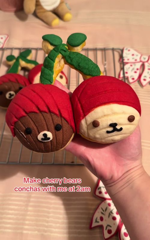 Make cherry bear conchas with me at 2am!! I was half asleep but they still turned out so cute! 😍 #conchas #fyp #pandulce #pan #foryoupage